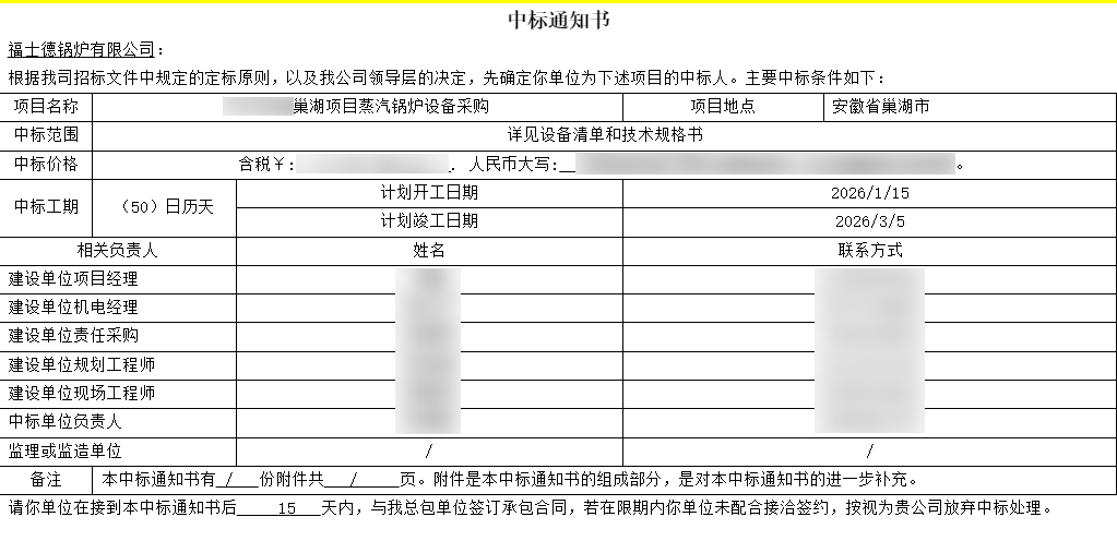 2026年伊始,福士德鍋爐再傳喜訊——成功中標(biāo)鋰電池龍頭企業(yè)新項(xiàng)目,斬獲2026年首份大單!該客戶再度選擇福士德,充分彰顯了行業(yè)龍頭企業(yè)對(duì)我們的高度信任與堅(jiān)定認(rèn)可!